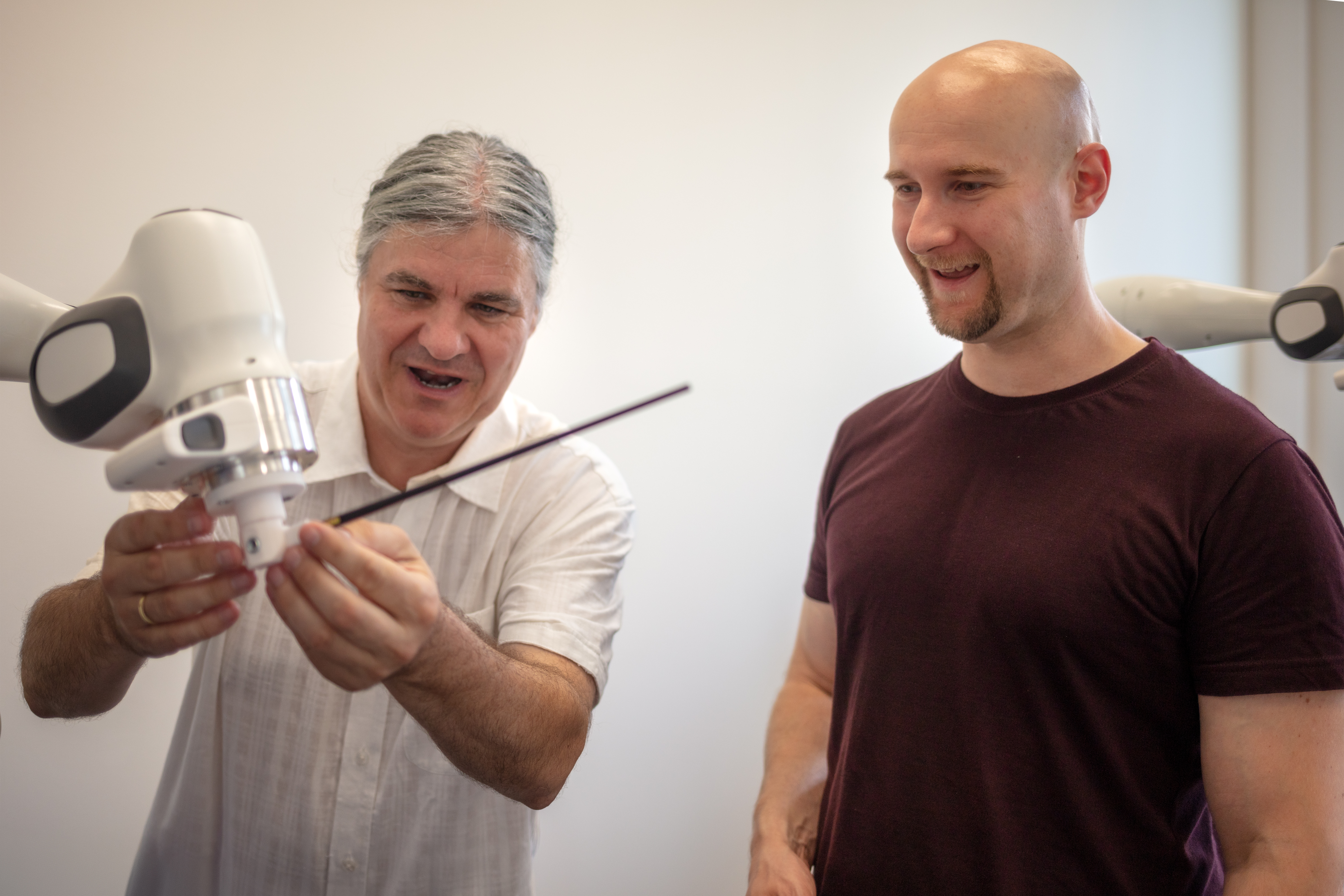 Markus Rindt: Wir müssen dem Roboter alle Stücke vorher beibringen. Dafür gibt es an jedem seiner drei Arme einen richtigen Handgriff. Dort kann man den Roboter packen und dann quasi mit ihm gemeinsam alle Bewegungsabläufe passend zur Musik einstudieren: also sowohl kleinere und größere Bewegungen als auch verschiedene Tempi. Das Dirigat muss dann nur noch abgespielt werden, als wäre es eine Aufnahme. Für die Musiker liegt die Herausforderung dabei darin, genau auf den Roboter zu reagieren und auf ihn zu schauen – denn dieser macht einfach stur nur das, was man ihm vorher gezeigt hat, und reagiert nicht auf das Orchester.